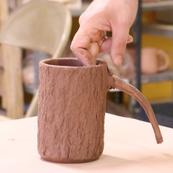 Bark mugs are formed from a textured slab formed into a cylinder. A slab base is added, and a handle is formed separately and pushed through the wall from the inside. Once the handle has dried a bit, additional parts are added to help it look more branchlike. Since the handles are unglazed, they are burnished several times as the mug dries to make it as smooth and comfortable as possible.