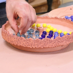 Like his other "marbleware" pieces, Tim's clocks are created by melting marbles in a clay frame in the kiln. A pattern is laid out beforehand, but what happens in the kiln as the glass moves is always a surprise, resulting in a truly unique piece each time. To attach the numbers to the face, as well as for safety and aesthetic reasons, these clocks use the same epoxy coating, which can sometimes be damaged if stored in below freezing temperatures for an extended period. They run on a single AA battery.