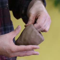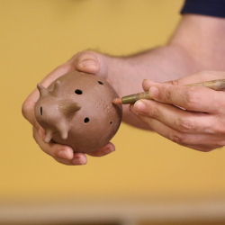 They are created by pinching a hollow form from a ball of clay. Once it has been closed up, a wooden paddle is used to create the basic shape. A rubber rib refines the shape as it dries, after which the sound holes are added, followed by the spikes, ears, tail, and other features. Finally, each ocarina has a pattern impressed with a rubber tool, into which glaze is painted during the glazing step. See below to hear some example ocarinas in action.